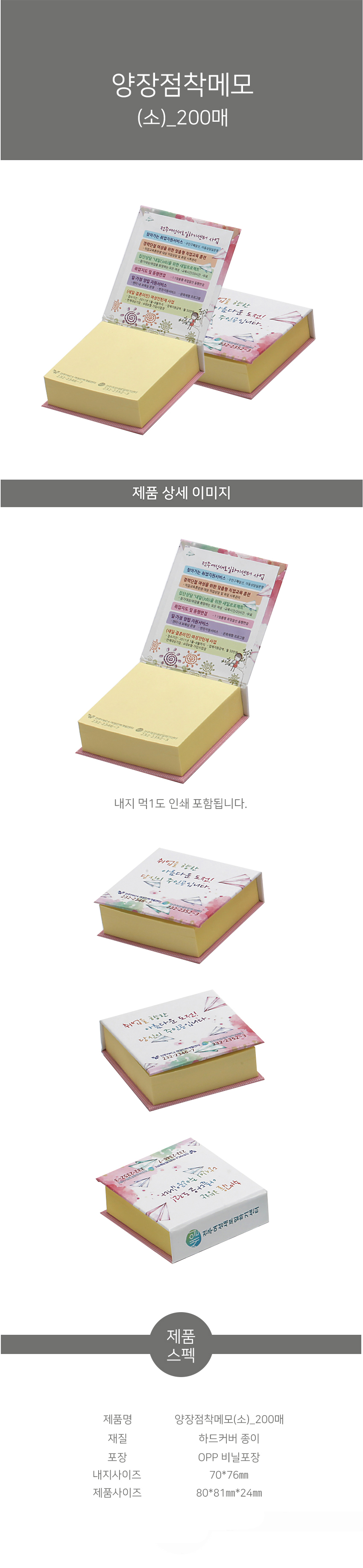 | 구성품 | 점착메모 70*75 200매 | 1박스입수량(변동가능) | 약 200개 |