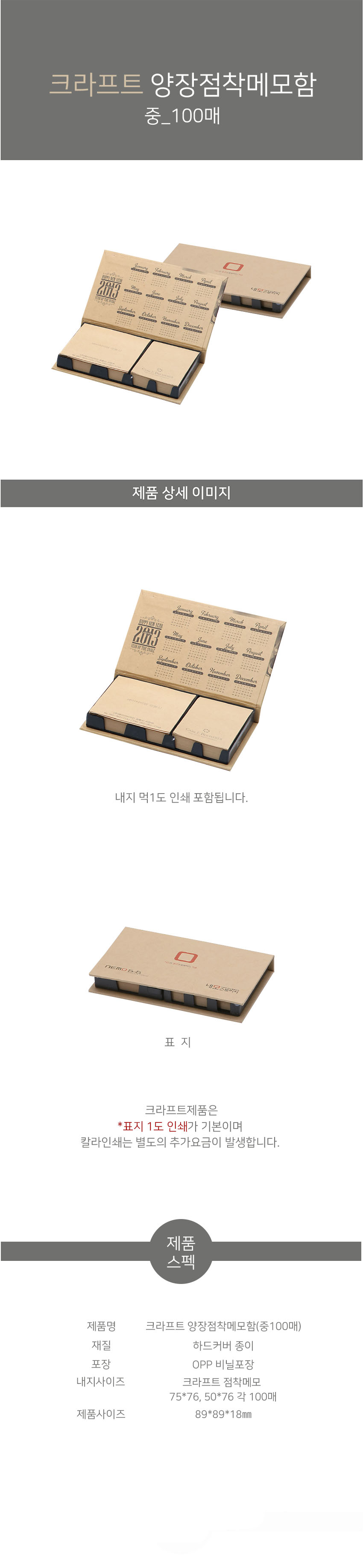 | 구성품 | 크라프트점착메모 75*75, 50*75 각 100매 | 1박스입수량(변동가능) | - |