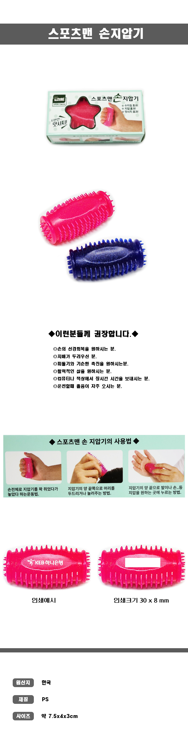 | 모델명 | 손지압기 | 제작기간(시안확정 후) | 인쇄시안 확정 후 3~7일 |